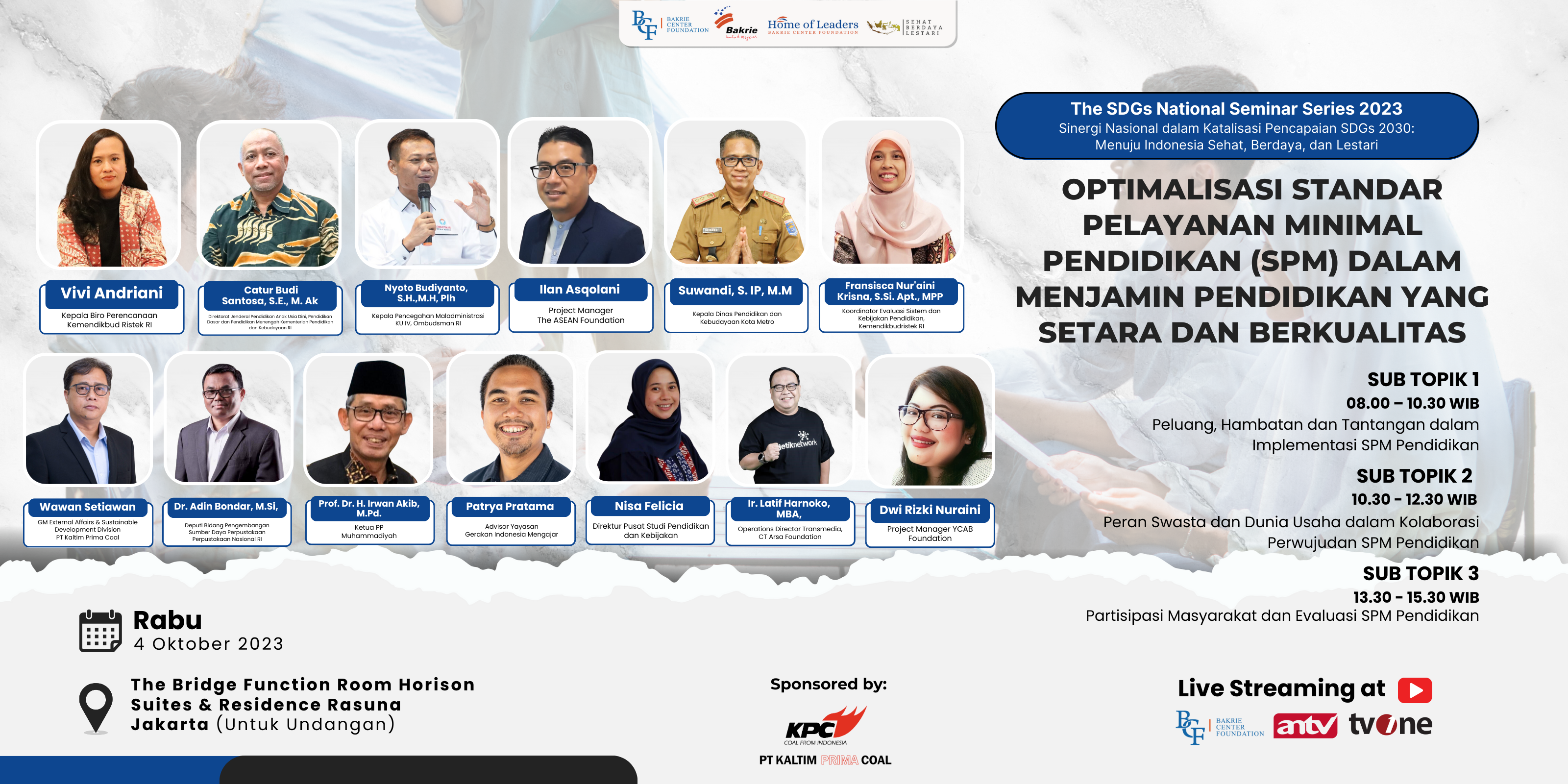 Pada Seminar Nasional tahun lalu, isu Anak Putus sekolah (APS) dan Anak Tidak Sekolah (ATS) menjadi bahasan inti terkait dengan kondisi pendidikan di Indonesia. Berdasarkan hasil kajian yang telah disusun dalam policy brief, salah satu permasalahan dasar yang menjadi faktor adanya ATS dan APS yang tinggi di Indonesia, berkaitan dengan kualitas pendidikan dalam aspek Standar Pelayanan Minimal (SPM) Pendidikan. Karenanya, di Seminar Nasional 2023 ini, tema yang diusung dalam pembahasan mengenai pendidikan, adalah “Optimalisasi Standar Pelayanan Minimal Pendidikan dalam Menjamin Pendidikan yang Setara dan Berkualitas”. Pembahasan ini tentunya juga akan terbagi menjadi 3 subtopik, antara lain: